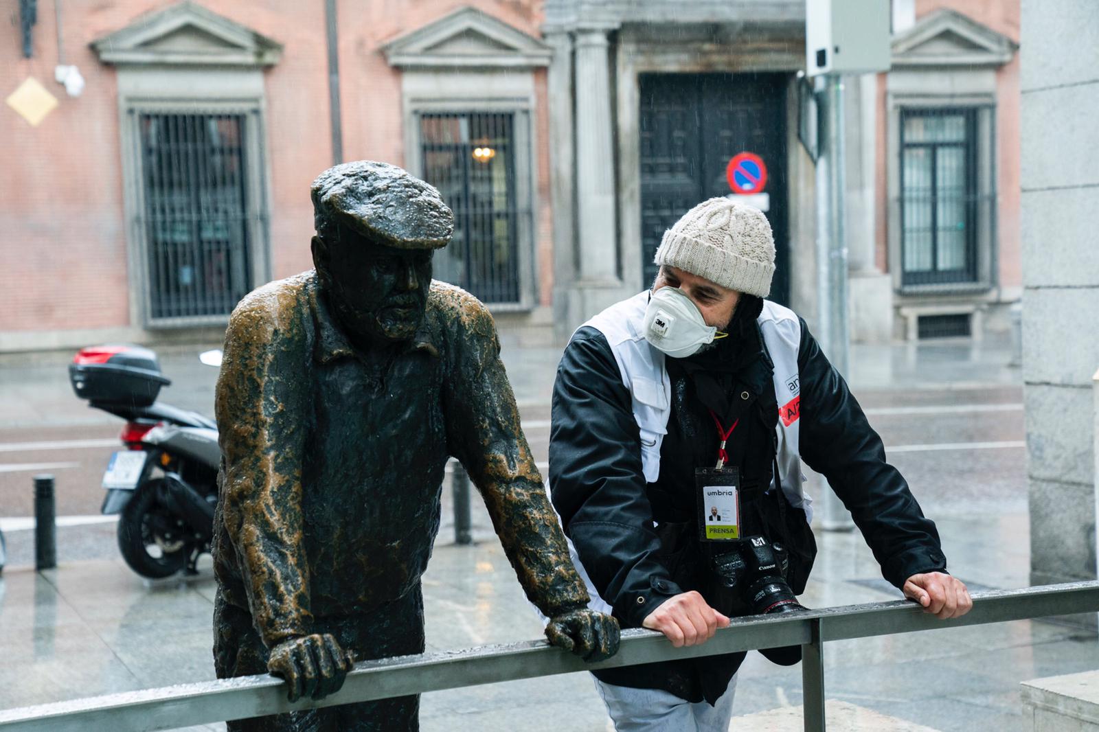 Le espera el coche de producción en la esquina. La función ya ha empezado. Pone un pie en el portal de la oficina cuando una voz dice: «prevenidos, acción». Entonces, se coloca bien la boina, sube las escaleras y los actores empiezan a hacer su papel. El portero abandona su sitio y pasa a no estar cuando se le necesita, tal y como aparece en su guión; el ascensor no funciona y las maletas de los guiris que viven temporalmente en el edificio le impiden avanzar para llegar al piso donde se desarrolla la trama.